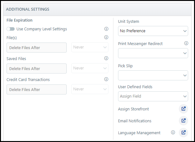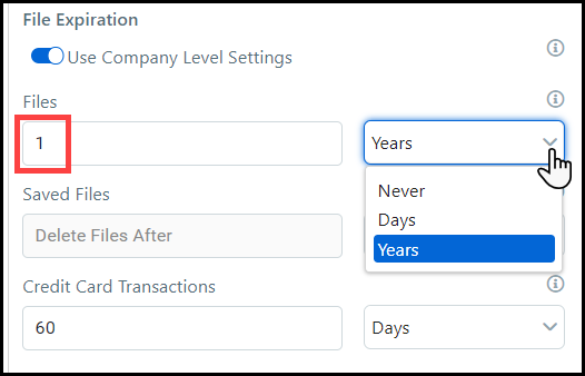 Turn the toggle switch on to specify file expiration settings for this company that are different from the file expiration settings you have specified at the site-level.