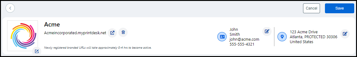 The Company Header is where you edit your company information. It is divided into four sections (Company Logo, Company URL, Contact Information, and Location).