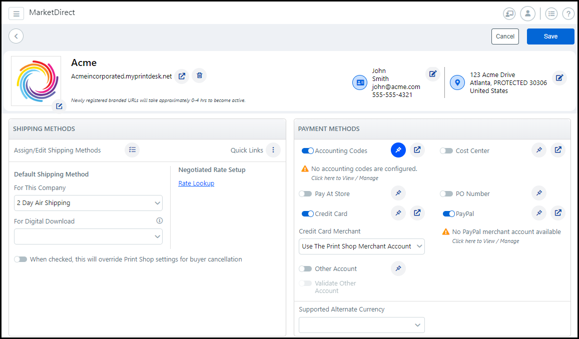 The Edit Company page is where you configure new companies or edit an existing company. It is divided into seven sections.