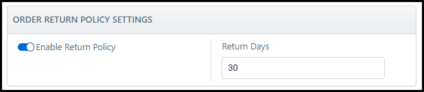 The Order Return Policy Settings section is where you enable and configure the return policy for MarketDirect Fulfillment products. Settings are enabled and configured using a toggle switch and field.