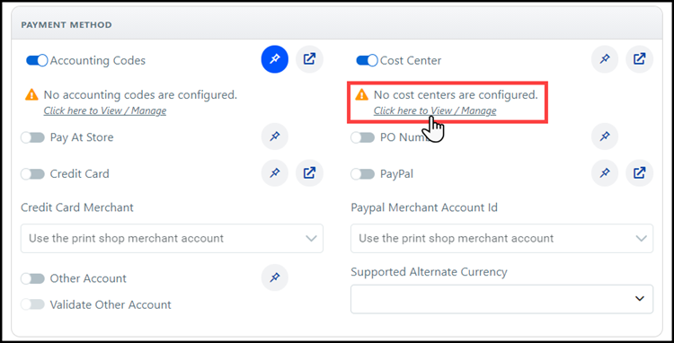 3 In the Payment Method section, click the View/Manage icon for the Cost Center toggle to open the Cost Centers page.