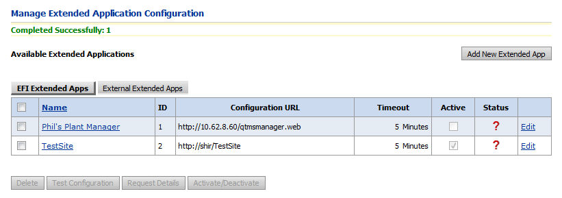 ● Add New Extended Application: Adds a new extended application (and a new row) to the Available Extended Applications table.