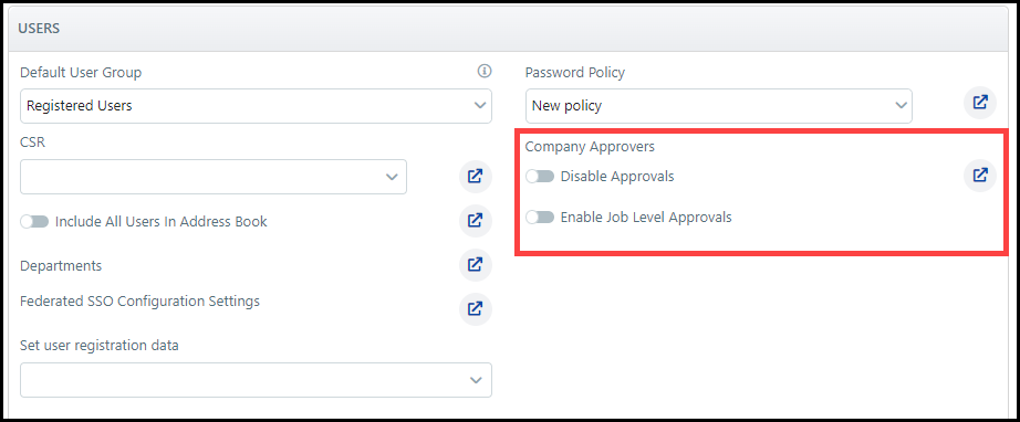 ● You can set up Job-level approvals for companies on the Manage Companies page (in the Job Level Approval Settings section; see Job Level Approval Settings for more information).