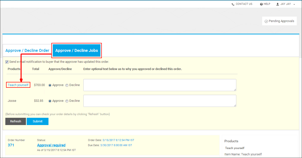 ● To approve, decline, or adjust a job(s) within the order, open the Approve / Decline Jobs tab and click the job name link.