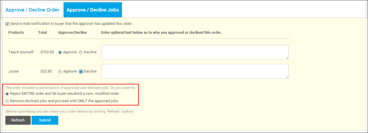 ● If you decline one or more jobs within the order and approve one or more jobs within the order, the declined jobs will be removed from the order. The adjusted order containing only the approved job(s) will be processed, and the buyer will receive an email notification informing him/her of your approval decisions and the order status as well as the reason you declined certain items (if you provide one, which is strongly recommended). The declined job will be removed permanently from the order, meaning it will not show up in the buyer's order history.