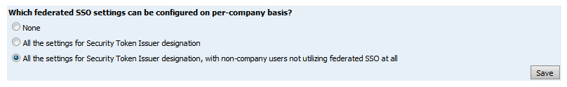 ● All the settings for Security Token Issuer designation: Select this option if you do not want companies (accessed via branded URLs) to use site-global settings but rather default to user name and password only. Note that you can enable and configure federated SSO separately for each company.
