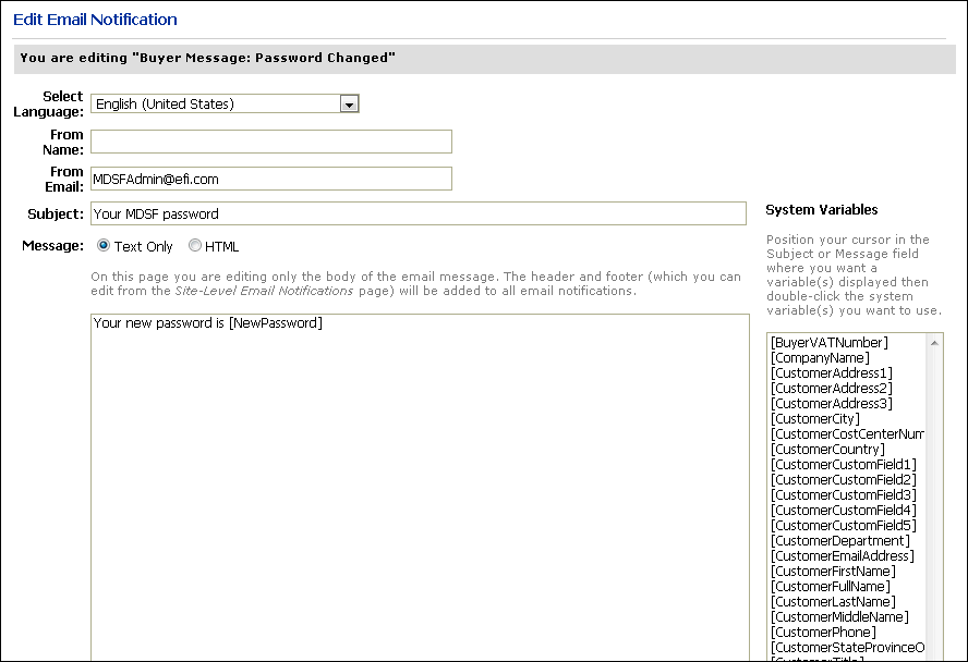 You can customize the content and format of site-level or company-level email notifications that MarketDirect StoreFront automatically generates and sends to customers at certain marker events (such as when a new user registers, the status of an order changes, a new password is generated, etc.).