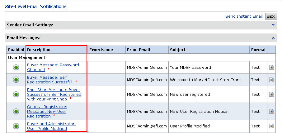 To see a complete list of the email notifications in MarketDirect StoreFront, see Email Notifications-Quick Reference.