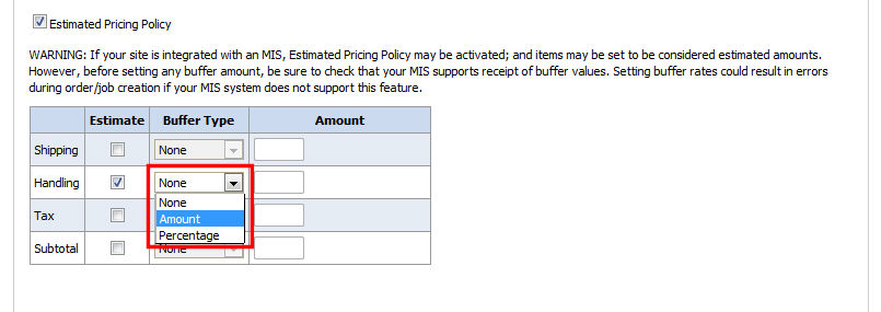 For sites integrated with an MIS: If you want to use the estimated pricing feature, make sure that your MIS supports receiving buffer values. If it does not, do not use estimated pricing because doing so could result in errors during the order process.