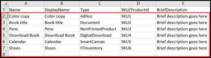 Type: Specify one of the six supported import product types: AdHoc, Document, NonPrintedProduct, DigitalDownload, SmartCanvas, and FFInventory