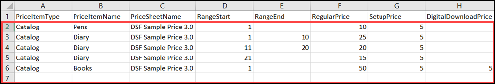 Warning: All of the fields, except for DigitalDownloadPrice, in the Products-Pricing spreadsheet are required. RangeStart and RangeEnd can be left blank if there is no range start or range end.
