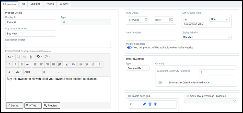 ● Maximum Order Qty Permitted: You can specify a maximum quantity of the product (up to 100,000) that can be ordered, which will be enforced in the cart.