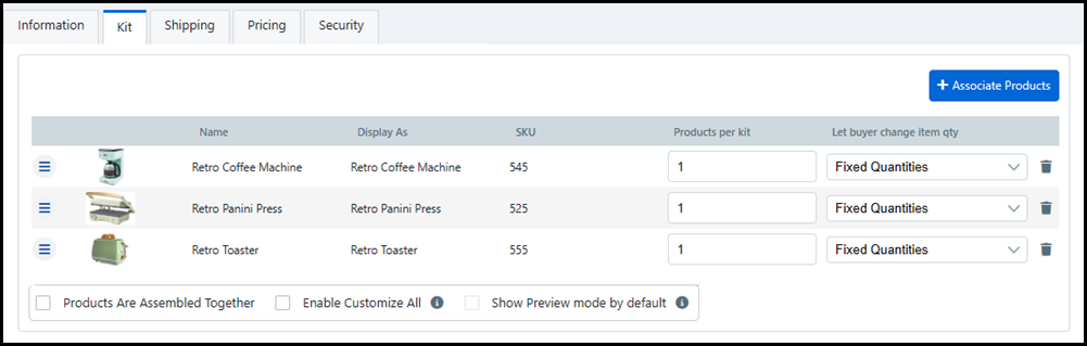 For instructions on creating Kit products using the classic product builder, see Create Products.