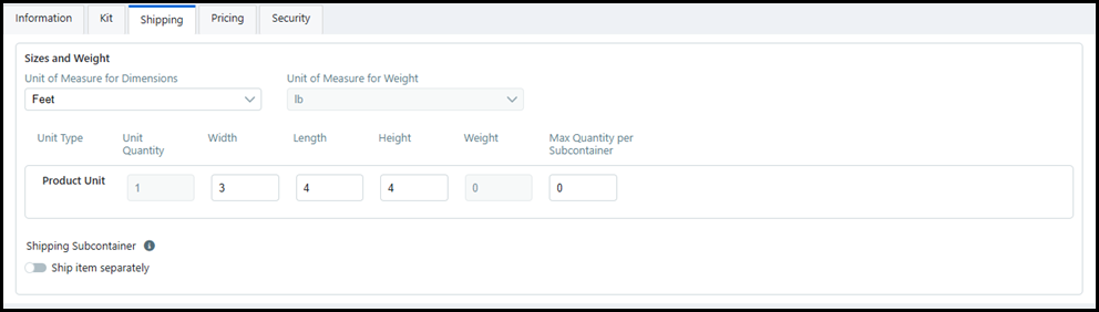 up product "Shipping"The Shipping tab is where you specify the product dimensions for shipping cost calculations.