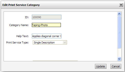 ● Help Text: Enter descriptive text for the print service category that will be shown to buyers on the storefront (for products with the Visual Product Builder UI, formerly Flex UI, enabled) when they hover over the print service category when ordering a product that offers the print service. Note that you can add/edit the help text only for print service categories that you add (not to those the come pre-loaded in MarketDirect StoreFront).