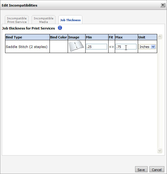 ● Intelligent Ticketing Relationship—This conditional ticketing feature lets you establish incompatibility rules so that when buyers select certain print services when ordering products they cannot also select incompatible print services, Media, and job thicknesses that the selected print service does not support. These rules prevent buyers from being able to make incompatible selections (such as duplex printing on transparent Media) during the product ticketing process. For information on setting up intelligent ticketing, see Intelligent (Conditional) Ticketing.