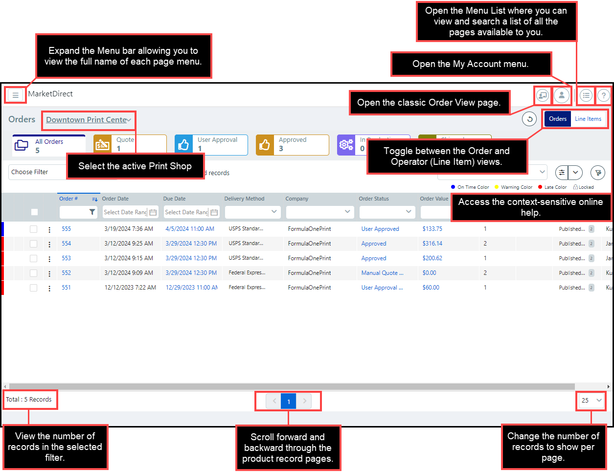 ● The image below shows the Order View (completely redesigned for v. 11.0) with call-outs describing various elements.