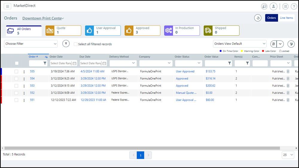 single job line items with in-line editing due date, order status,