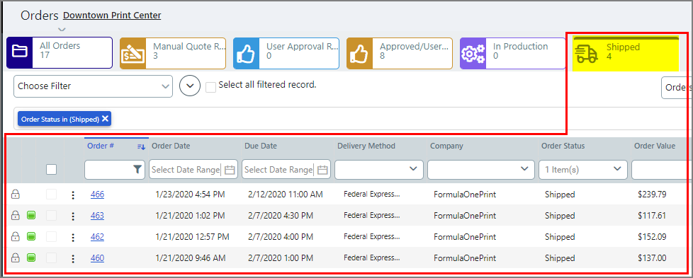 ● Alphabetical value data columns (e.g., Job Name, Product Name, Document, etc.) can be filtered with like searches and will automatically begin filtering with every entered character. For example, a search for fold will return all order names that include the characters fold (i.e., fold, folders, folding, foldy, etc.). Removing Filters ● To
