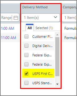 Delivery method for the order. To filter on this attribute: In the column header field, select an option from the drop-down list. |