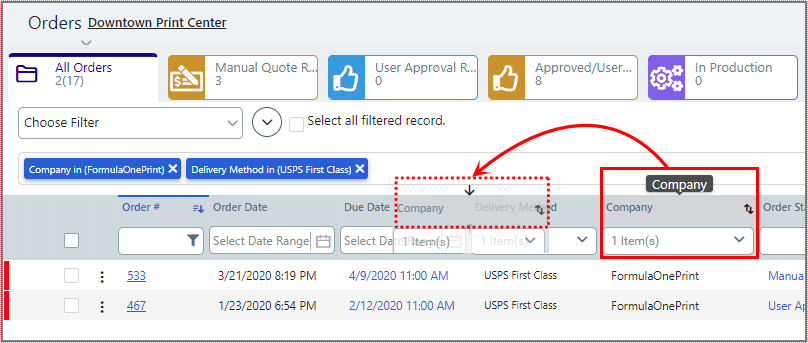 Company associated with the order. To filter on this attribute: In the column header field, select an option from the drop-down list. |