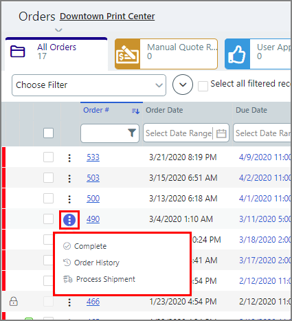Opens the quick access menu that lets you perform the following order management tasks for each order in the orders table: ● Complete ● Order History ● Process Shipment (or Open Shipment to view details of a shipment that has already been processed) ● Open Shipment |
