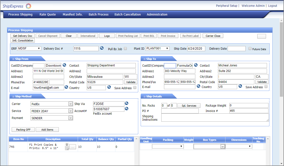 ● Process Shipment / Open Shipment: These options are for sites integrated with the optional licensed shipping module ePS ShipExpress and opens the ShipExpress application.