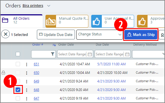 3 In the Order View, select the job to track (1) and then click Mark as Ship (2).