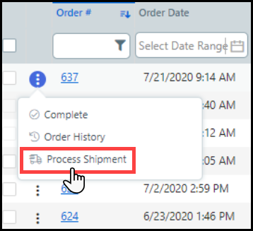 2 On the Order View, locate the order to execute, hover on the three dots and click Process Shipment.
