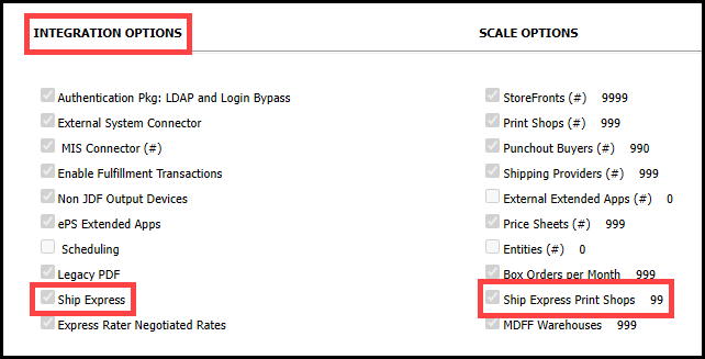 ● Scroll down to the INTEGRATION OPTIONS section and verify that the Ship Express option is selected. When the license is enabled, you can add a shipment system and associate it with a Print Shop.