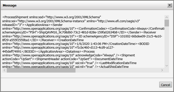 4 Click View XML to open a Message window showing the XML for the transaction.
