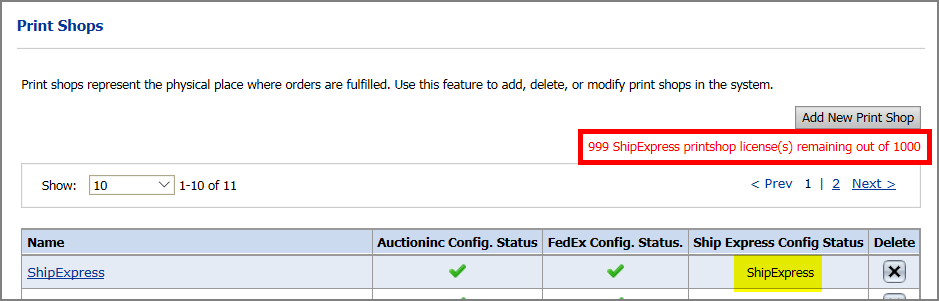 This license controls the maximum number of Print Shops that can be associated with Ship Express. There is one-to-one mapping between a Print Shop and the Ship Express system. So once a Ship Express system is mapped to a Print Shop, it cannot be mapped to any other Print Shop in your system.