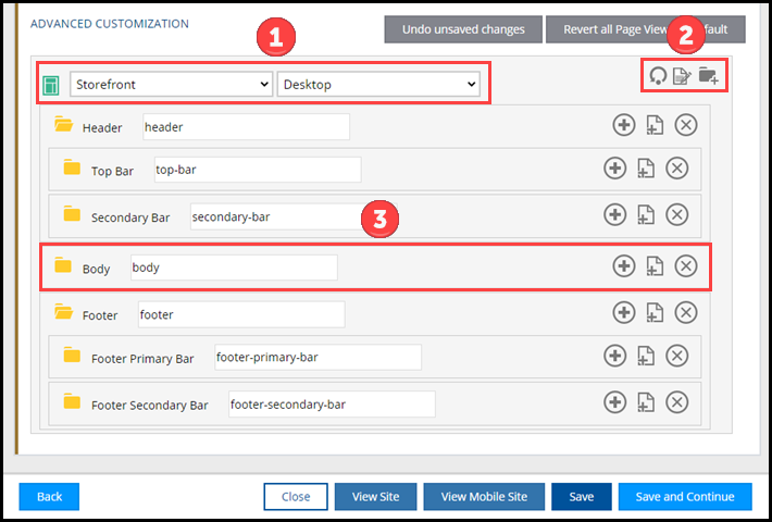 On the Advanced Customization page, the pages and elements are arranged in the order in which they appear on the storefront. You can change the order by dragging and dropping.
