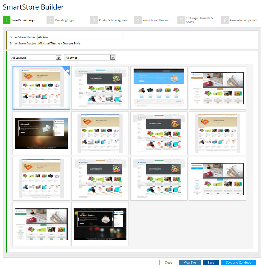 1 Select the overall design (style and layout) for the SmartStore, each of which has several color theme options, from the available options by clicking thumbnail images on the page.