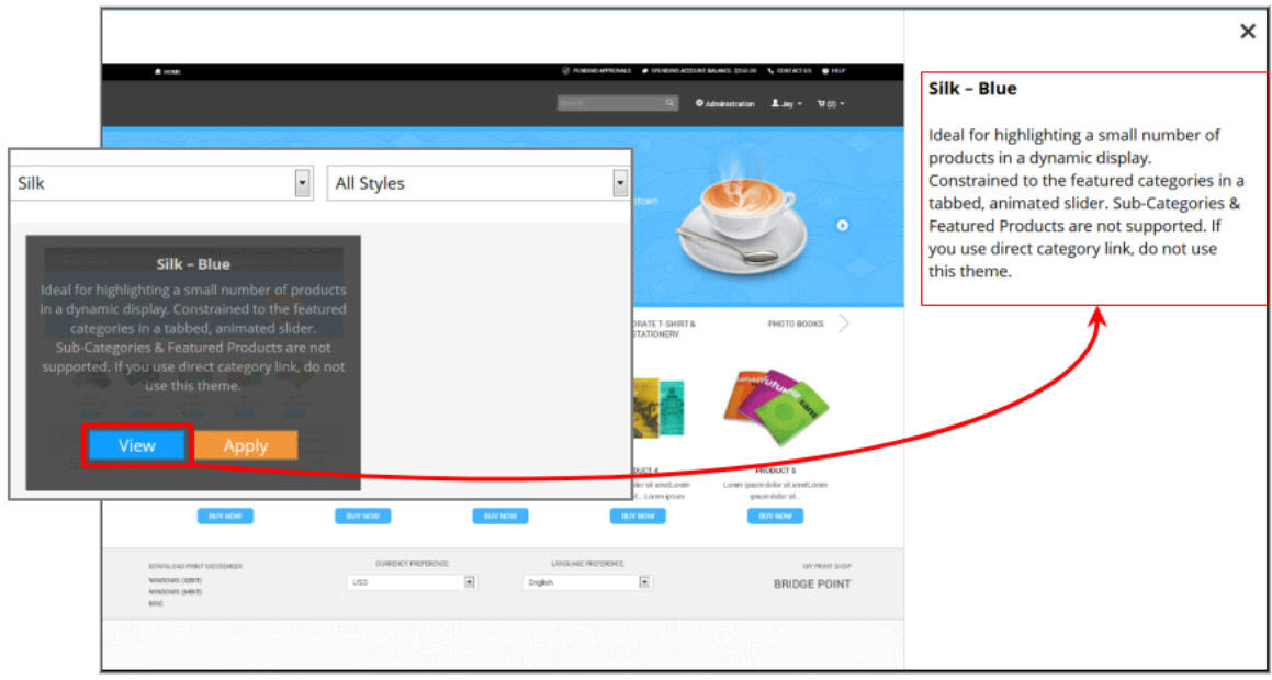 SmartStore Design - Choose a DesignThe first step is to select the overall theme (style and layout) of your SmartStore from the available options. MarketDirect StoreFront ships at present with five basic site themes. Each layout has several color themes and was designed to suit a particular storefront type. For instance, the Silk theme shown below is ideal for sites that want to highlight only a small number of products in a dynamic display.