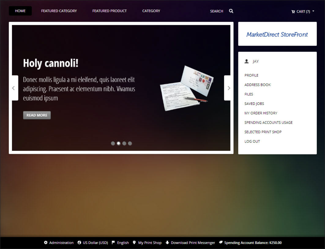The Minimal theme, with its prominent display of featured categories and products and large carousel-type promotional banner, works well for sites with large or small product sets.